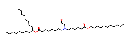 We can test all of this on standard LNP ionizable lipids, such as ALC-0315, which has the following SMILES, retrieved from the known_IL_combined.tsv file written in this post.