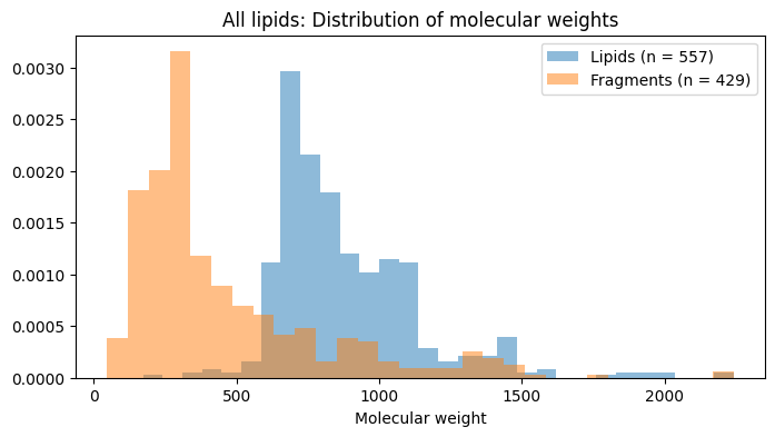 import matplotlib.pyplot as pltinput_lipid_desc, molecule_info_program, frags_program = decompose_dataset(all_smiles, rxn_smarts_dict, rxn_codes, reaction_types=['esterification'])lipid_tags_df, frag_count_df, rxn_codes_df = compute_fragment_counts(input_lipid_desc, frags_program, rxn_codes)frag_count_df.set_index('SMILES', inplace=True)newcols =list(frag_count_df.columns)for i inrange(3, frag_count_df.shape[1]): sndx = np.where(np.array(all_smiles) == frag_count_df.columns[i])[0]iflen(sndx) >0: newcols[i] = all_structures['name'][sndx[0]]frag_count_df.columns = newcolsnewrows =list(frag_count_df.index)for i inrange(frag_count_df.shape[0]): sndx = np.where(np.array(all_smiles) == frag_count_df.columns[i])[0]iflen(sndx) >0: newcols[i] = all_structures['name'][sndx[0]]frag_count_df.index = newrowsimport rdkit.Chem.Descriptorsdata_chemwts = [Chem.Descriptors.ExactMolWt(Chem.MolFromSmiles(x)) for x in all_smiles]data_fragwts = [Chem.Descriptors.ExactMolWt(Chem.MolFromSmiles(x)) for x in frags_program]data1 = data_chemwts + data_fragwtslbls1 = ['structures']*len(data_chemwts) + ['fragments']*len(data_fragwts)def plot_hist_molwts(data1, data2, fam_name): plt.figure(figsize=(8, 4)) plt.hist(data1, bins=30, label=f'Lipids (n = {len(data1)})', alpha=0.5, density=True) plt.hist(data2, bins=30, label=f'Fragments (n = {len(data2)})', alpha=0.5, density=True) plt.xlabel("Molecular weight") plt.title(f"{fam_name}: Distribution of molecular weights") plt.legend() plt.show()plot_hist_molwts(data_chemwts, data_fragwts, 'All lipids')