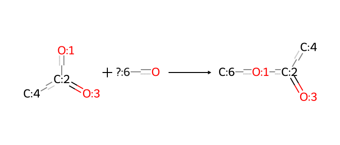 # Serialization code for each reaction type.rxn_codes = {"esterification": "R1",}def generate_infix_smiles_decomp( lpd, molecule_info_program, frags_program, rxn_codes, delimiter="_", parens="()"):""" Generate an infix expression for a molecule, based on a decomposition according to database reactions. Works only on binary reactions at present! Parameters ---------- lpd : :obj:`str` SMILES string of the input molecule. molecule_info_program : :obj:`dict` Decomposition dictionary, mapping each product molecule to a reaction and fragments that constitute it. frags_program : :obj:`list` of :obj:`str` List of SMILES strings of the fragments. delimiter : :obj:`str`, optional Delimiter to use between components. Default is ``'_'``. parens : :obj:`str`, optional Parentheses to use around the molecule. Default is ``'()'``. Returns ------- :obj:`str` : Infix expression for the molecule, containing SMILES of all components. """if lpd notin molecule_info_program: # it's a fragmentreturn lpd components = molecule_info_program[lpd]["components"] reaction_type = molecule_info_program[lpd]["reaction_type"]# Check if this is a single product, repeated twice (e.g. symmetric disulfide formation)if (len(components) ==1 ): # Must be duplicated reactants, since this is a binary reaction components += components component_exprs = [ generate_infix_smiles_decomp(c, molecule_info_program, frags_program, rxn_codes)for c in components ] expr_list = [ parens[0], component_exprs[0], rxn_codes[reaction_type], component_exprs[1], parens[1], ]for i inrange(len(expr_list)):if (expr_list[i] in ["(", ")"]) or expr_list[i].startswith("R"):continueif expr_list[i] in frags_program: frag_ID ="F"+str(frags_program.index(expr_list[i])) expr_list[i] = frag_ID# print('Previously unknown fragment: ' + expr_list[i])returnf"{delimiter}".join(expr_list)