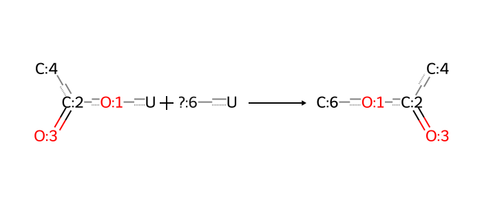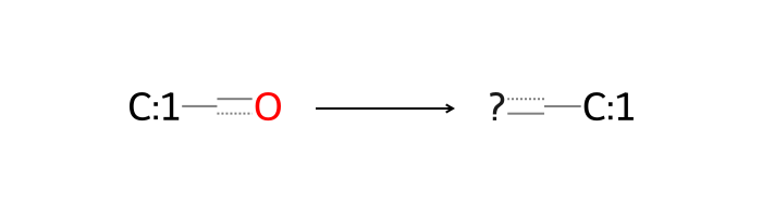 But the dehydration involves removal of a heteroatom, and therefore won’t fit in the RDKit synthon schema. Instead, the heteroatom must be taken out of one of the reactants. In this case, the natural chemical choice is the alcohol, leading to a reaction that does fit into the RDKit synthon schema. (Recall that the attachment points are labeled with transuranics [U], [Np], etc as specified above.)