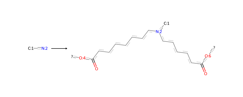 According to the esterification reaction outlined above, the first reactant should be a carboxylic acid, with two acid moieties that will form ester linkages with tails. As explained further in the other post on ultralarge scoring, we can create variants of SM-102 by varying this head fragment systematically according to a comprehensive list of thousands of primary amines known in the literature. We substitute each of the hydrogens on the primary amine with an alkyl spacer chain leading to an acid reactive moiety, which will join with a tail synthon. This substitution reaction results in a set of synthons, corresponding to the first (acid) reactant in the esterification.