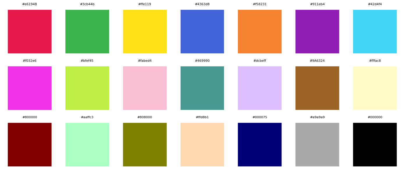 import matplotlib.pyplot as plt, matplotlib.colorsimport numpy as npimport seaborn as sns# Visualize a list of colors in a pleasing waydef visualize_discrete_colors(colors, ncols=10):""" Display a list of colors in a grid layout. Args: colors: List of color strings (hex codes or named colors) ncols: Number of columns in the grid (default 10) """# Calculate number of rows needed ncolors =len(colors) nrows =int(np.ceil(ncolors / ncols)) plt.figure(figsize=(2*ncols, 2*nrows))# Plot each color as a filled rectanglefor idx, color inenumerate(colors): row = idx // ncols col = idx % ncols plt.subplot(nrows, ncols, idx +1) plt.fill([0, 1, 1, 0], [0, 0, 1, 1], color=color) plt.axis('equal') plt.axis('off') plt.title(color, fontsize=8) plt.tight_layout() plt.show()