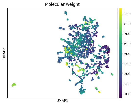 The metadata passed in can drive the scatterplot in several ways, including color and legend driven by columns of the dataframe. The tooltip itself is a fully customizable html div, which is crucial to depict images, especially well-defined vector-based images like chemical structures.