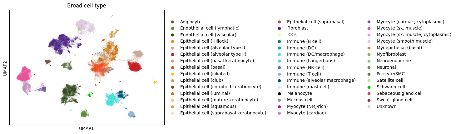 obs: 'n_genes', 'fpr', 'tissue', 'prep', 'individual', 'nGenes', 'nUMIs', 'PercentMito', 'PercentRibo', 'Age_bin', 'Sex', 'Sample ID', 'Participant ID', 'Sample ID short', 'RIN score from PAXgene tissue Aliquot', 'RIN score from Frozen tissue Aliquot', 'Autolysis Score', 'Sample Ischemic Time (mins)', 'Tissue Site Detail', 'scrublet', 'scrublet_score', 'barcode', 'batch', 'n_counts', 'tissue-individual-prep', 'Broad cell type', 'Granular cell type', 'introns', 'junctions', 'exons', 'sense', 'antisense', 'intergenic', 'batch-barcode', 'exon_ratio', 'intron_ratio', 'junction_ratio', 'log10_nUMIs', 'leiden', 'leiden_tissue', 'Tissue composition', 'Cell types level 2', 'Cell types level 3', 'Broad cell type numbers', 'Broad cell type (numbers)', 'Tissue', 'channel'